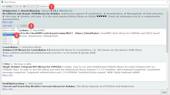 Step 4 : Adding the ArduinoJson library.Open Tools > Manage Library and install ArduinoJson version 5.13.5 library.